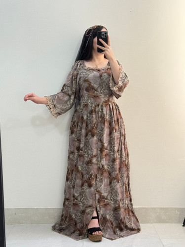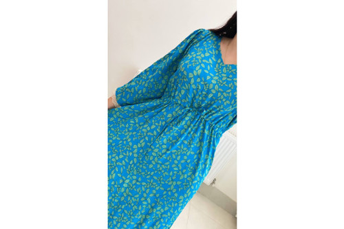 پیراهن بلند نخی طرح برگ رنگی با آستین چیندار مناسب مهمونی یا بارداری کد ٨٣